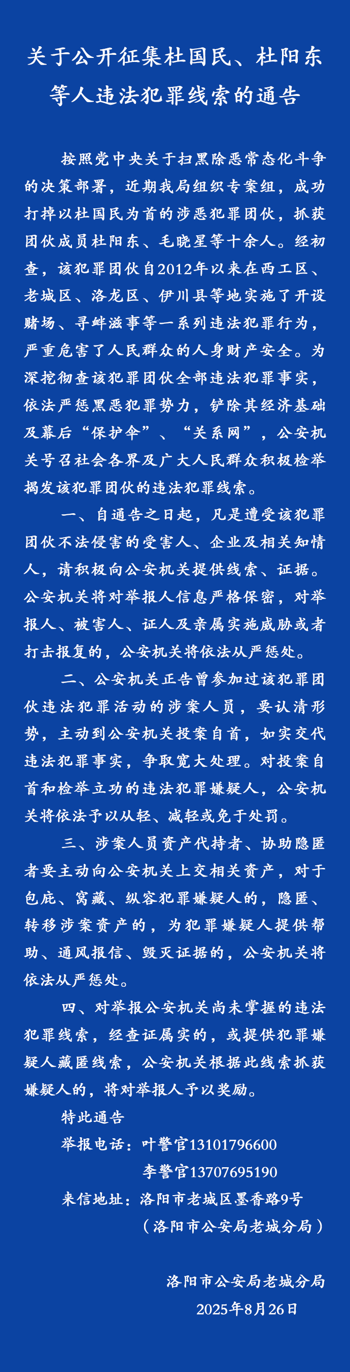 8月26日,河南省洛阳市公安局老城分局发布《关于公开征集杜国民、杜阳东等人违法犯罪线索的通告》,全文如下: